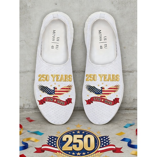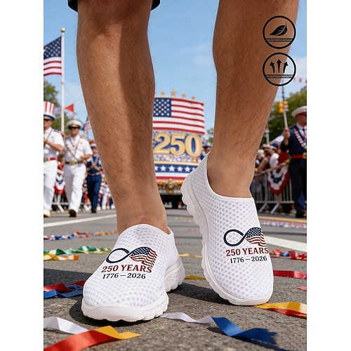 Sneakers slip-on da uomo grigie con grafica 250 Years – scarpe da passeggio leggere e traspiranti con tema bandiera americana, ideali per abbigliamento casual, eventi festivi, viaggi e attività