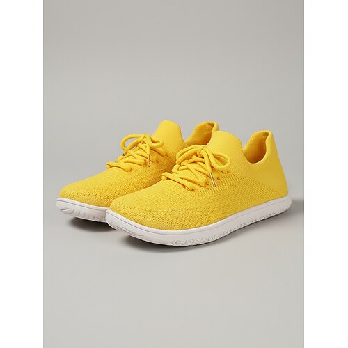 Sneakers da donna gialle leggere in maglia, vestibilità ampia: scarpe da passeggio traspiranti con lacci, ideali per viaggiare, per l'uso quotidiano e per un comfort casual.
