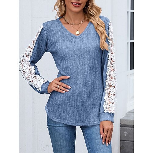 Per donna Blusa Tinta unica Elegante Essenziale Casual Manica Lunga Scollo a V Top Regolari Quotidiano Pizzo Patchwork Blu Nero Rosa Verde militare Fucsia Primavera Autunno Inverno
