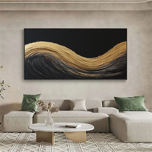 dipinto ad olio fatto a mano nero oro testurizzato arte murale onda dipinto ad olio su tela 3d impasto oceano spatola arte moderno astratto lusso grande decorazione orizzontale