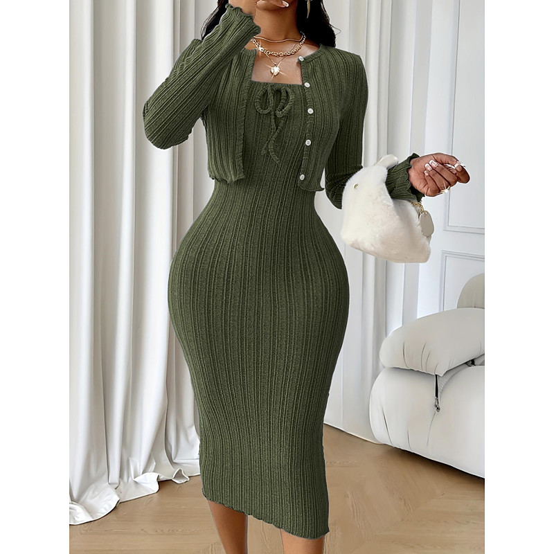 Women's Dress Set Sheath Dress Elegant Plain Buttons Midi Dress Long Sleeve Crew Neck Outdoor Vacation Blue Green Gray Spring Fall Regular Fit