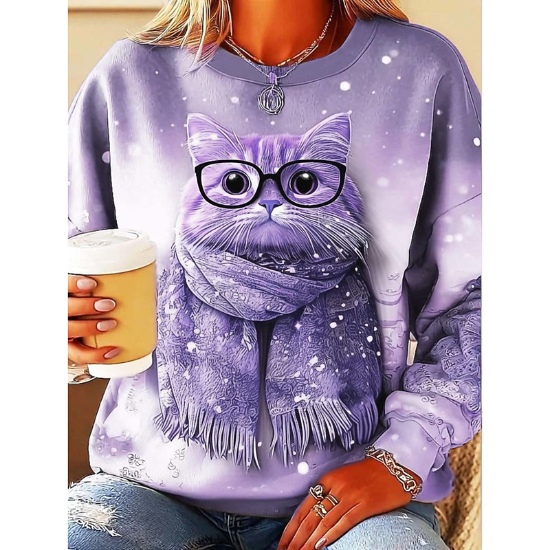 Women's Sweatshirts Graphic Animal Cat Casual Long Sleeve Crew Neck Regular Tops Street Dailywear Casual Print Pink Purple Khaki Gray Spring Fall Winter
