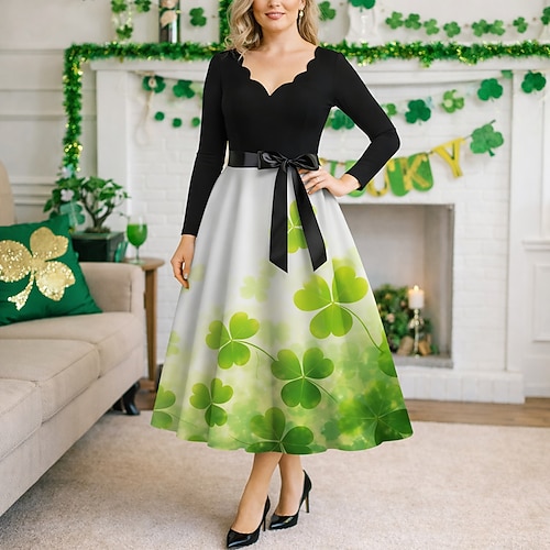 St. Patrick 2026 1950er Retro Vintage Knielang Kleid A-Linie Kleid Teekleid langarm Kostüm Damen St. Patrick's Day Party Festival Teenager Erwachsene Kleid Abschlussballkleider Sommer Frühling