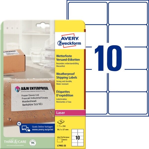 Avery Zweckform Wetterfeste Versandetiketten, 99,1 x 57 mm, weiß, Polyester, Laser s/w, Farblaser