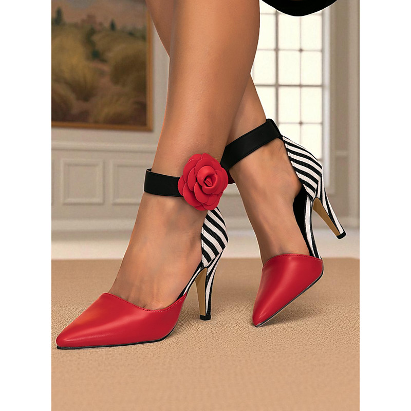 Women's 1950s-Inspired Striped Stiletto Heels with Red Rose Ankle Strap – Retro Pointed Toe Pumps for Parties, Performances Date Nights