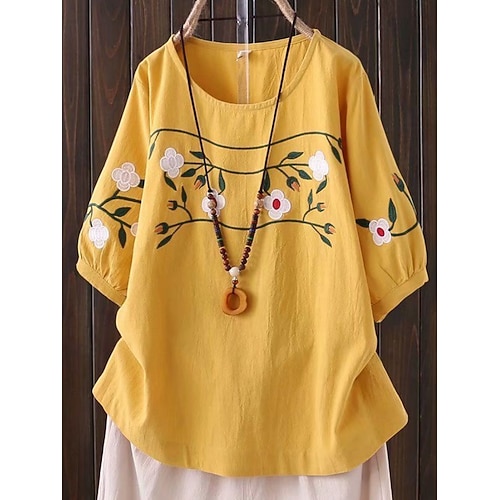 Camicia in lino donna in misto cotone ricamata floreale vintage casual maniche 3/4 colletto a giro top regolari quotidiani bianca gialla blu navy viola estate primavera autunno