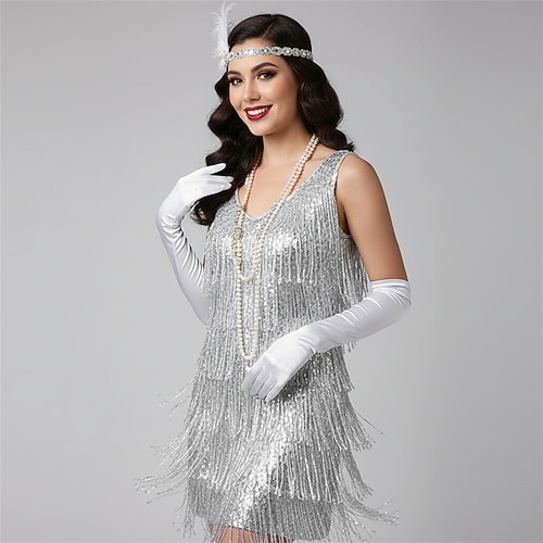 Set Retrò Vintage Anni 1920 Mini Lunghezza corta Abito Flapper Vestito Abiti con accessori Senza maniche Il grande Gatsby Invitato al matrimonio Frangia con nappe Tinta unita Nappa Scollo a V Costume