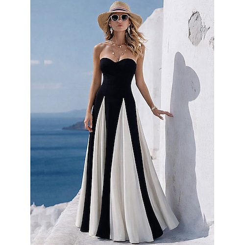 Per donna Abito maxi Abito a trapezio Elegante Festa cocktail All'aperto Feste Ospite di nozze Patchwork Vestibilità regolare Blocco di colori Senza Maniche Senza Spalline Nero