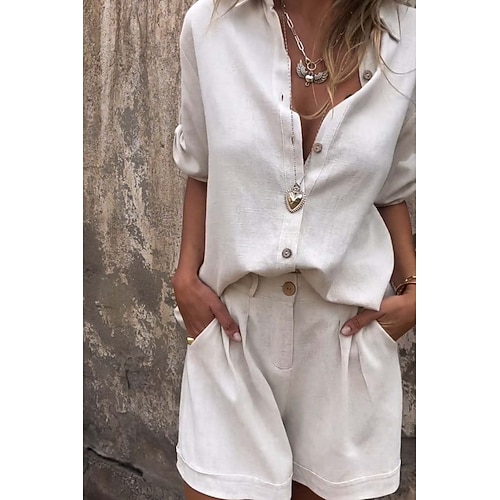 Per donna Set di biancheria in cotone Set di Pantaloncini Mezza Manica Colletto a Camicia Tinta unica Elegante Moda Streetwear Casuale Quotidiano All'aperto Blu Nero Bianco Estate Vestibilità regolare
