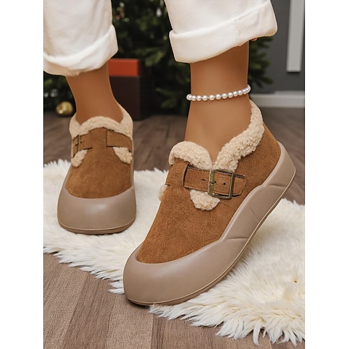 scarpe slip-on larghe da donna in finta pelle scamosciata rossa con calda fodera in peluche e dettaglio fibbia, comode calzature casual invernali per interni abbigliamento da esterno