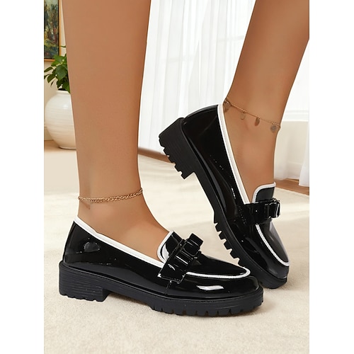 mocassini da donna in similpelle verniciata rossa con fiocco e suola con plateau spesso: eleganti scarpe slip-on per l'ufficio e l'uso quotidiano