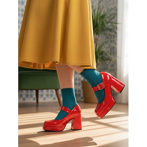 scarpe con plateau in similpelle verniciata rossa da donna – tacchi alti e spessi con cinturino con fibbia, stile retrò audace anni '80 per feste, eventi formali e Natale