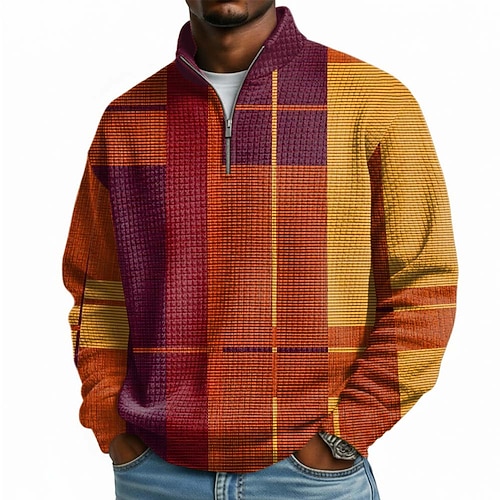 Per uomo Geometrico Plaid Nido d'ape Felpa Moda Quotidiano Classico Casual Collo alla coreana Zip a un quarto All'aperto Casa Ufficio Lavoro Giallo Viola Arancione Grigio Con zip Autunno Inverno