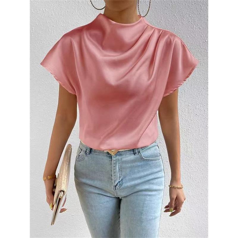 Women's Shirt Elegant Dressy Satin Solid Color Daily Stylish Casual Short Sleeve Crew Neck Regular Tops Daily Patchwork Black White Pink Summer Spring Fall
