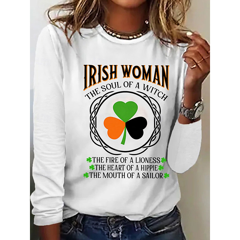 St. Patrick's Day Women's T Shirt Graphic Shamrock Letter Stylish Classic Casual Long Sleeve Crew Neck Regular Tops Daily Print Blue Black White Pink Beige Spring Fall