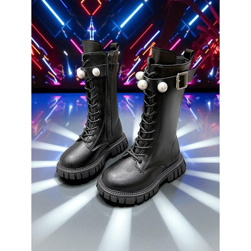 Kid's Korean Idol Inspired Pop Star Costume Shoes - Black Faux Leather Boots with Pearls and Bow Details, Perfect for Dress-up, Stage Performances, and Fashion Shows