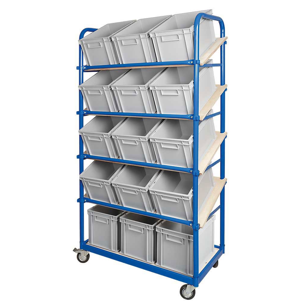 BRB Schrägbodenwagen, 5 Ebenen, 4 Lenkrollen, 15 Euroboxen 400x300x235 mm, grau