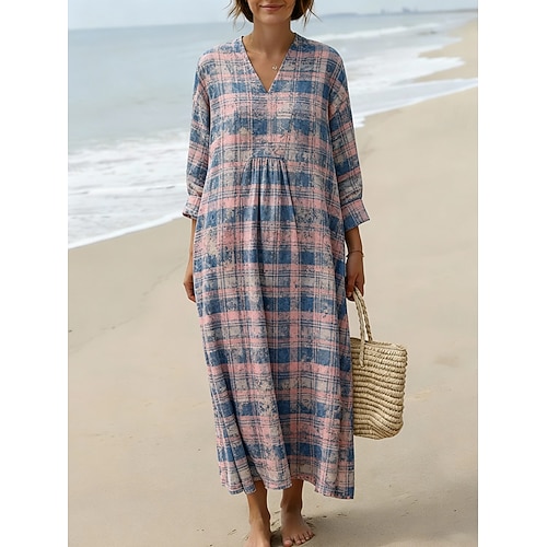 Per donna Abito Midi Vestito Casual Abito a Tubino Vintage Quotidiano All'aperto Vacanza Vestibilità comoda Plaid Manica Lunga Scollo a V Blu Estate Primavera Autunno