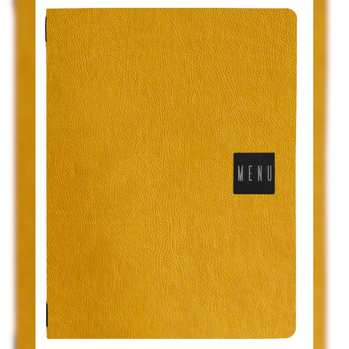 Stil Casa, Set 12 Speisekartenhalter A4, Polyurethan, 24,3x31,6 cm, 3 Innenhüllen, Gummiband, Farbe Ockergelb.