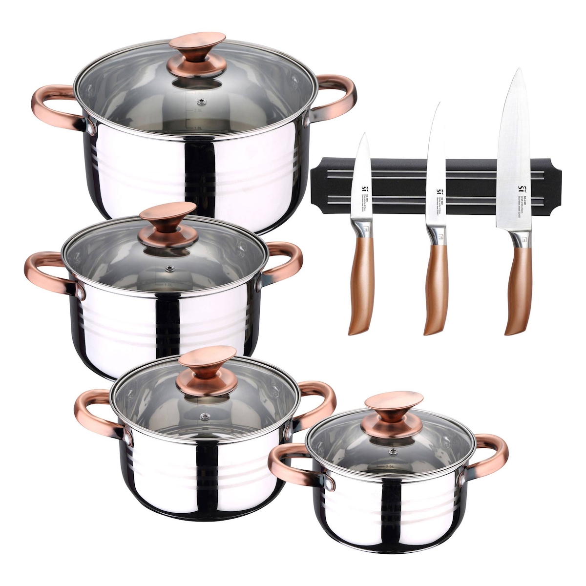 BERGNER - NONA 8-teiliges Kochgeschirr-Set (16/18/20/24cm) aus Edelstahl, induktionsgeeignet, mit 3-teiligem Messerset und magnetischer Wandhalterung