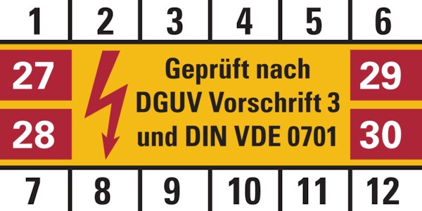Prüfplakette ab 27, DGUV Vorschrift 3 & DIN VDE 0701 - Bogen = 10 Plaketten - 50 x 25 mm Folie selbstklebend