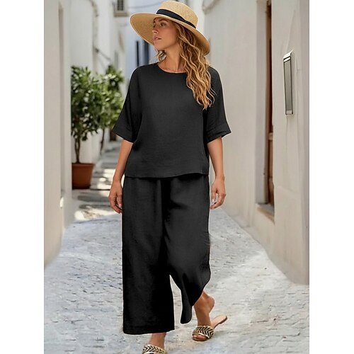 Per donna Set di biancheria in cotone Set di Pantaloni Mezza Manica Girocollo Semplice Arricciato Attivo Streetwear Quotidiano All'aperto Vacanza Nero Bianco Verde militare Estate Vestibilità comoda