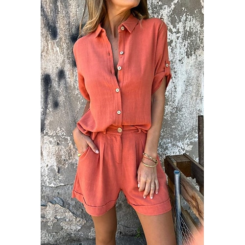 Per donna Set di biancheria in cotone Set di Pantaloncini Mezza Manica Colletto a Camicia Tinta unica Elegante Moda Streetwear Casuale Quotidiano All'aperto Blu Nero Bianco Estate Vestibilità regolare