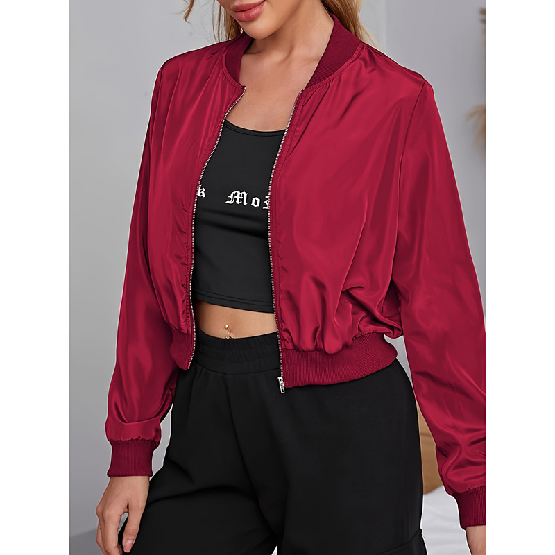 Women's Bomber Jacket Comfortable Breathable Zipper Casual Plain Vacation Street Casual Daily Wear Zipper Short Stand Collar Regular Fit Long Sleeve Outerwear Black Red Army Green Spring Fall