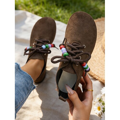 scarpe stringate da donna con punta larga e perline colorate - comode ballerine in finta pelle scamosciata, stile bohémien, per viaggi, passeggiate e uscite informali