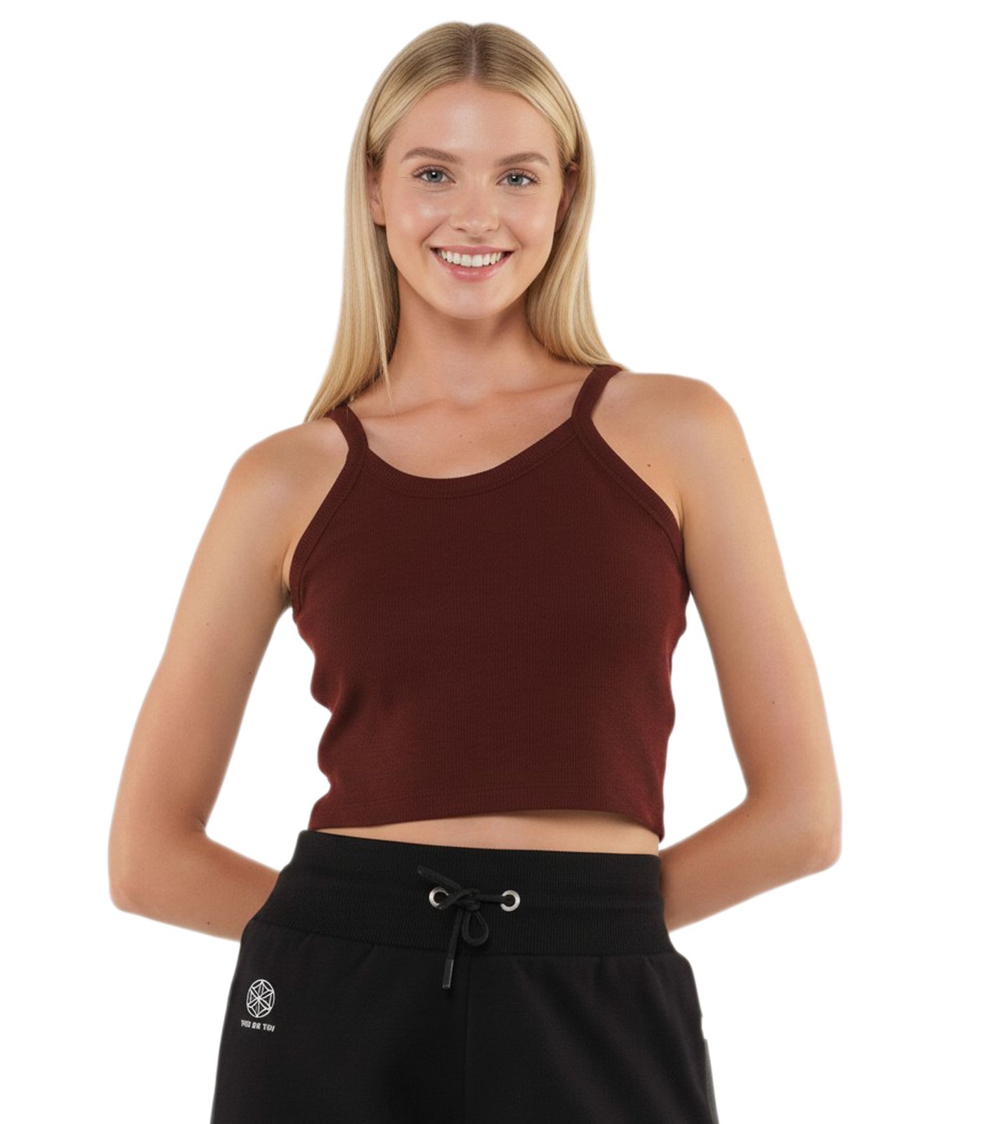 Canotta da donna in cotone a coste, modello crop top, modello fitness, modello yoga, stile YOU DO YOU, 905101, colore marrone mogano