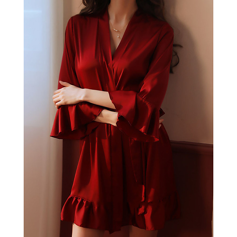 Women's Loungewear Robe Nightgown Fashion Casual Soft Pure Color Ruffle Patchwork Dress Home Vacation Long Sleeve V Neck Lotus Pink Black White Wine Green Summer Spring Fall Regular Fit