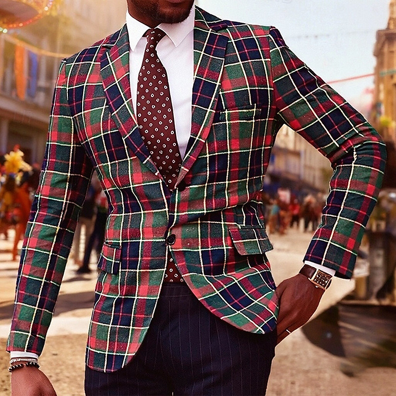 Men's Blazer Business Carnival Cocktail Party Fashion Casual Spring Fall Polyester Plaid Pocket Buttons Comfortable Single Breasted Blazer Dark Red Red