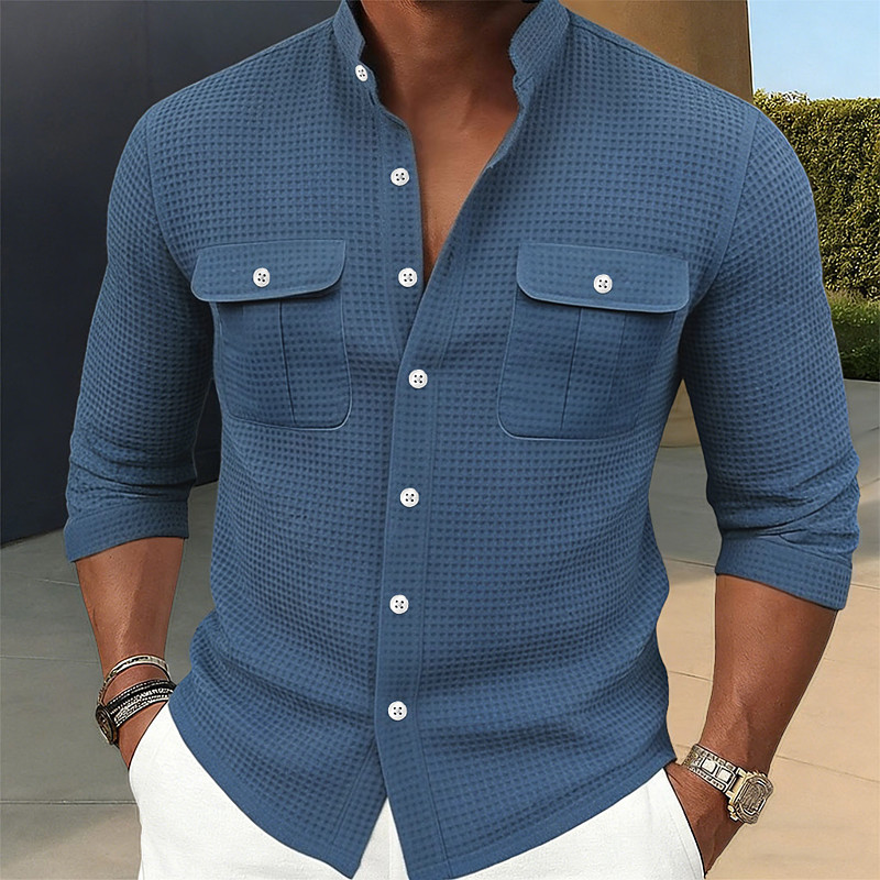Men's Men T Shirt Collared Shirt Waffle Knit Shirt Pink Navy Blue Green Gray Long Sleeve Solid Color Grandad Collar Casual Home Multi Pocket Clothing Apparel Traditional / Vintage Casual