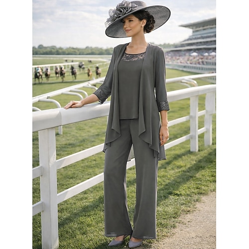 Tuta Completo Pantalone Tre Pezzi Lunghezza al pavimento Abito da cerimonia per signora Senza Maniche Scollo a Barca Elegante Taglie Forti Con Stola Ospite di nozze Chiffon Abiti con Giacca con Tinta