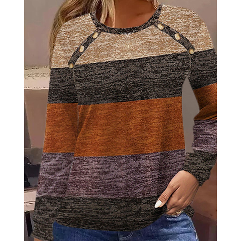 Women's T Shirt Tee Top Striped Casual Long Sleeve Crew Neck Regular Tops Daily Going out Weekend Patchwork Buttons Red Blue Orange Gray Spring Fall