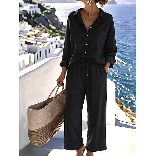 Set di pantaloni in cotone e lino da donna Bolero Top Camicia a maniche lunghe Colletto Colore solido Moda Streetwear Casuale Quotidiano Outdoor Blu Nero Bianco Estate Vestibilità ampia