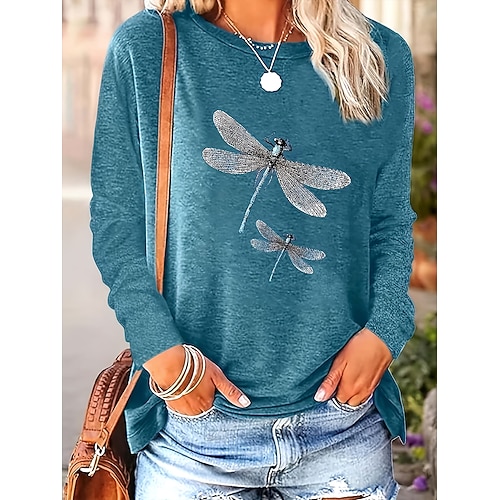 Per donna Maglietta Grafico Animale Libellula Vintage Elegante Classico Manica Lunga Girocollo Top Regolari Quotidiano Stampato Nero Blu marino Azzurro Primavera Autunno Inverno