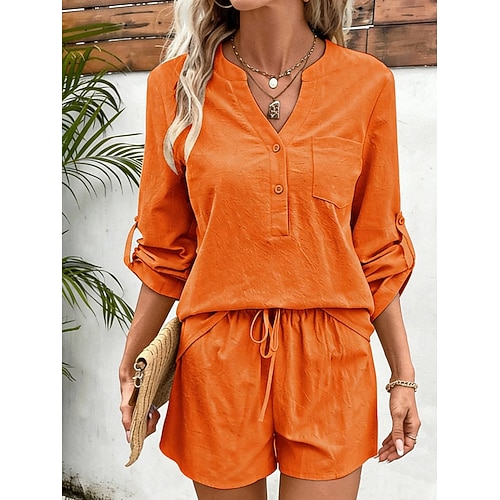 Per donna Set di biancheria in cotone Set di Pantaloncini Manica Lunga Scollo a V Semplice Coulisse Elegante Moda Streetwear Casuale Quotidiano All'aperto Nero Rosa Arancione Estate Vestibilità comoda