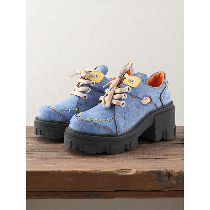Women's Green Genuine Leather Chunky Sole Lace-Up Casual Shoes – Retro Leather Oxford Style Shoes for Autumn Fashion and Outdoor Walking