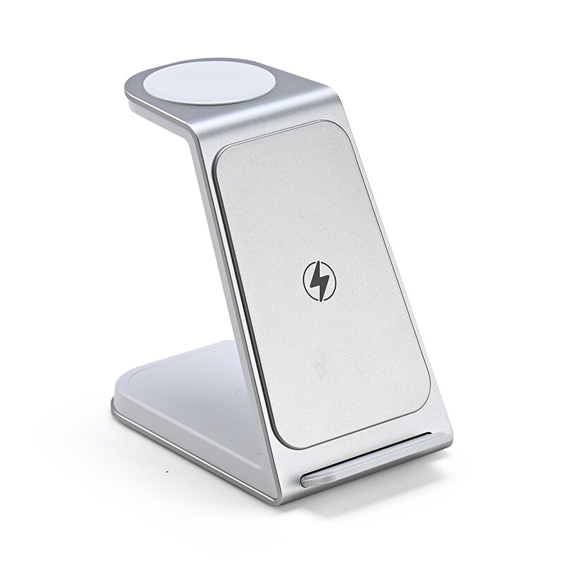 Rexsun 3-in-1 Wireless Charger, 22W Schnelllade-Station für den Schreibtisch, Aluminiumlegierung, Handy- und Uhr-Ladeständer für iPhone Air/17/16/15/14/13/12/11/Pro Max/X/8, Apple Watch, Netzadapter Nicht Enthalten, T6, Silber