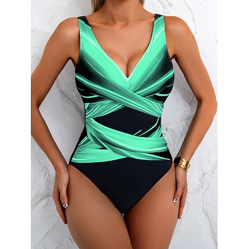 Costume da bagno intero da donna snellente monokini arricciato controllo della pancia vita alta snella elegante vacanza grafico ombre scollatura a V senza maniche
