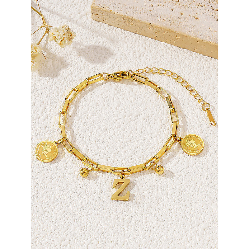 Women's Gold-Plated Alphabet Letter Bracelet with Coin and Ball Charms, Adjustable Chain, Stylish Christmas Gift for Her, Personalised Jewelry Accessory