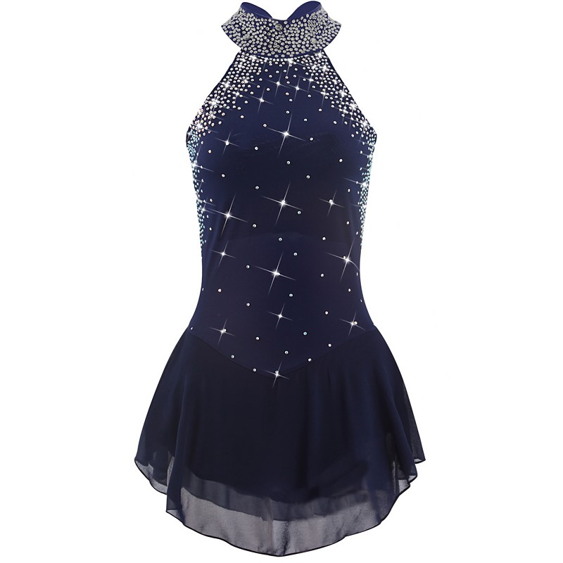 Figure Skating Dress Women's Girls' Ice Skating Dress Outfits Dark Navy Open Back Mesh Spandex High Elasticity Training Practice Professional Skating Wear Handmade Crystal / Rhinestone Sleeveless Ice