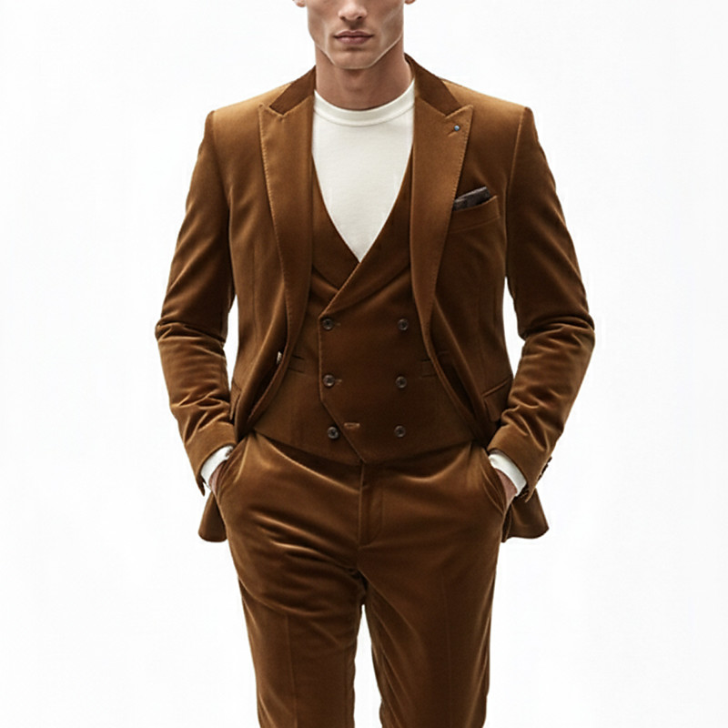 Men's Business Casual Velvet Suit Peaked Lapel Black Burgundy Fashion Daily Solid Colored Tailored Fit 3 Piece Double Breasted Six-buttons