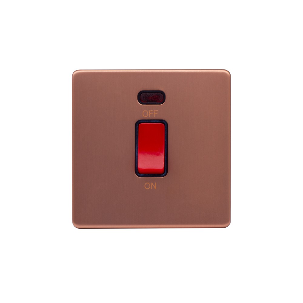 Lieber Brushed Copper 45A 1 Gang Double Pole Switch - Single Plate - Black Insert Screwless - Size: 86mm x 86mm x 3.1 mm