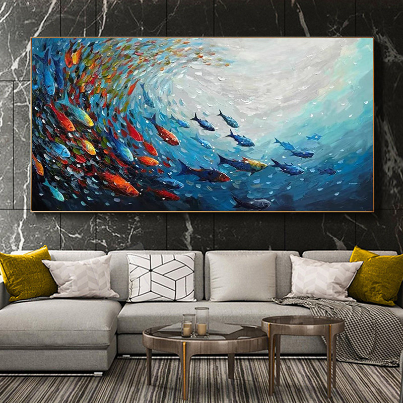 Handmade Abstract Blue Sea Fishes Canvas Painting Nordic Art Graffiti Large Size Modern Living Room Home Decoration Picture No Frame