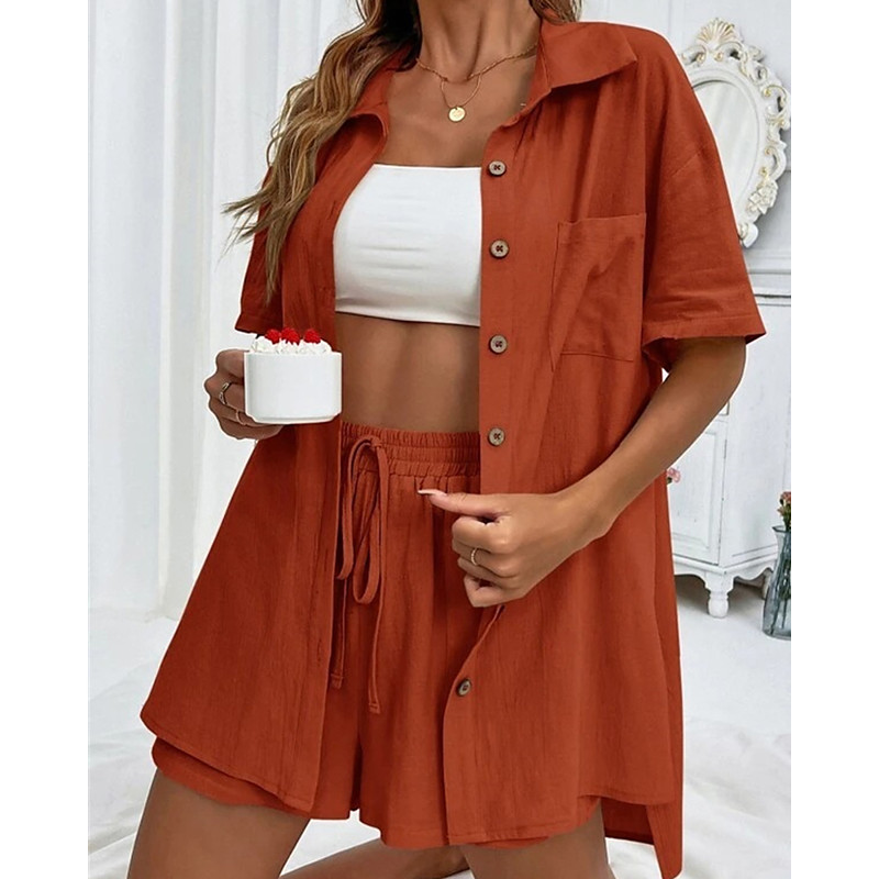 Women's Fashion Streetwear Shirt Linen-Inspired Sets Two Piece Sets Below Knee Length Shorts Short Sleeve Shirt Collar Solid Color Drawstring Daily Wear Date Pink Army Green Orange Summer Regular Fit