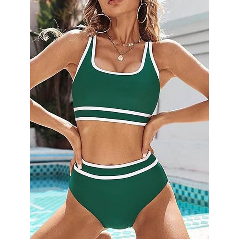 Women's Bikini 2 Piece Swimsuit Colorblock Briefs Slim Backless Vacation Beach Wear Solid Color U Neck Sleeveless Bathing Suits