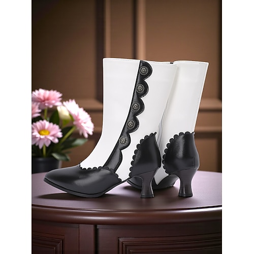 stivaletti da donna in stile vittoriano anni '20, bianchi e neri: eleganti in similpelle con bordi smerlati e dettagli con bottoni, tacco a gattino per occasioni vintage e formali