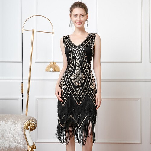 Anni Ruggenti Anni 1920 Lunghezza al ginocchio Abito Flapper Senza maniche Il grande Gatsby Paillettes Frange Scollo a V Costume Per donna Natale Carnevale Mascherata Festa a tema retrò Danza